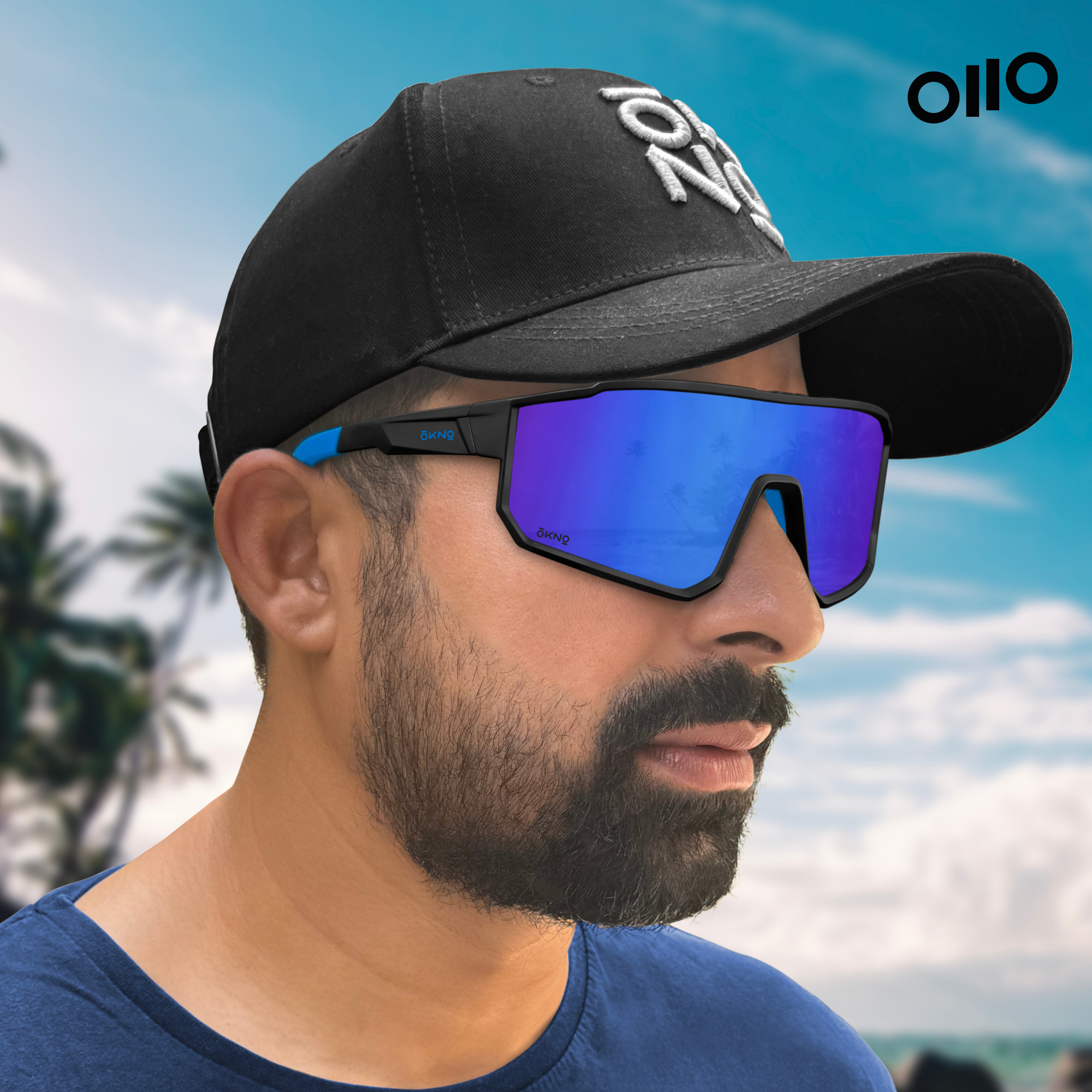 A sleek black frame with a bold blue-purple gradient lens, blue OKNO Griplock™ temple tips, and a blue nose pad. Built for adventure with 100% UV protection.